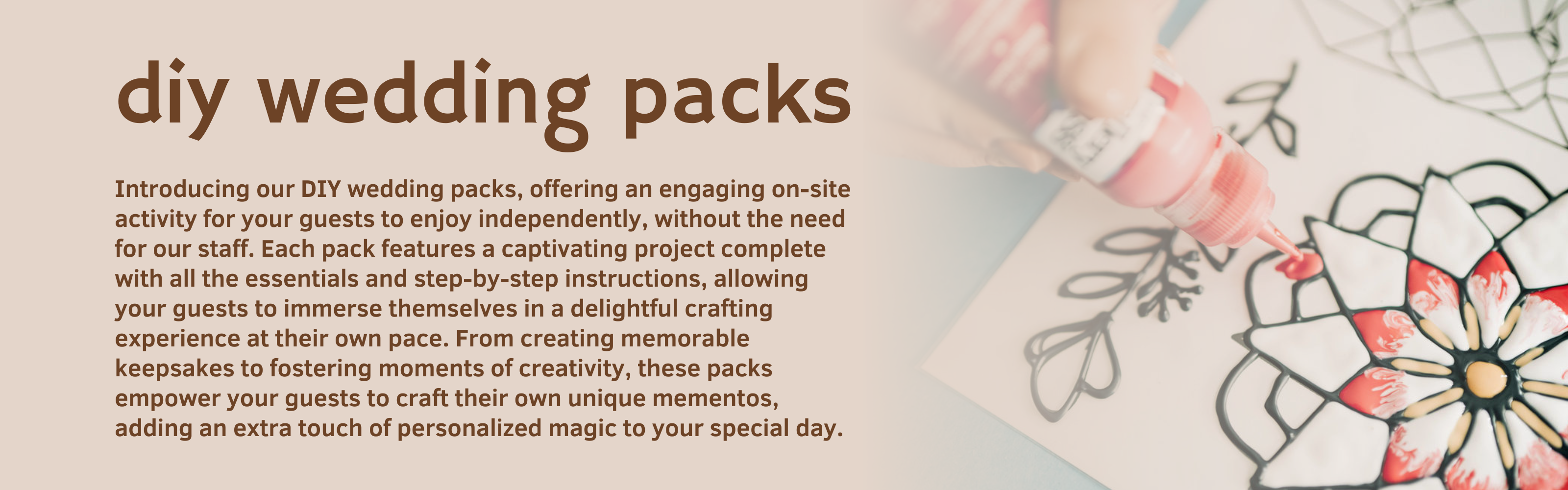 We offer a variety of different DIY wedding packs. Each of these packs come with all the materials, tools, and instructions for a fun and engaging activity. These can be done during the welcome party, after the rehearsal dinner, or for some post matrimony creativity. These packs allow an activity for guests to do to not only have fun, but be able to take home a memorable keepsake from a day you'll never forget. Below are some of our DIY Wedding Packs.
